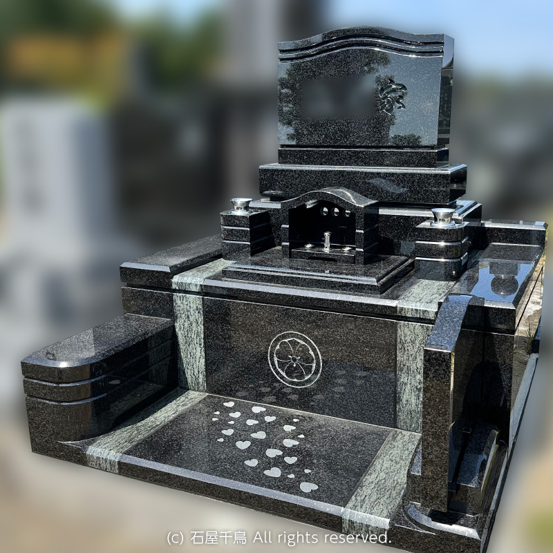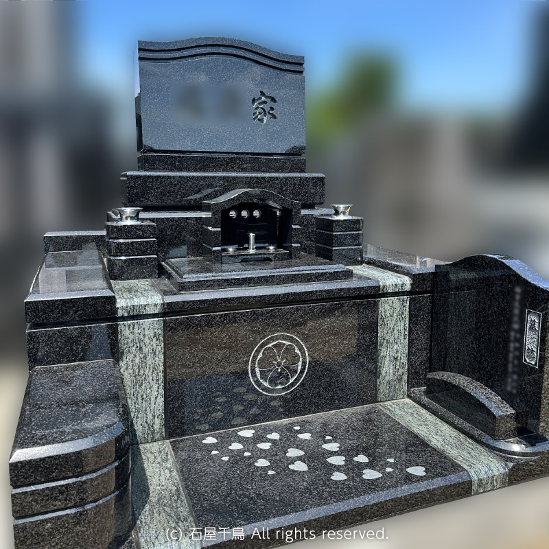 石屋千鳥です。この度、デザイン墓石 Sachi[幸]を建立いただきました。高級感あるどっしりとしたフォルムと、オリーブグリーンのアクセントが映える、すばらしいお墓です。流れるようなオリーブグリーンの石目はとても美しく、重厚感も兼ね備えたお墓に仕上がりましたかと存じます。ご家族みなさまにお喜びいただけたこと、スタッフ一同うれしく存じます。数ある墓石店から当店にご縁を賜りましたこと、誠にありがとうございました。これからもご安心いただけますよう、しっかりサポートさせていただきたく存じます。