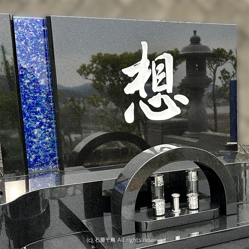 この度は、デザイン和墓「ルビー」をご建立いただき、誠にありがとうございました。想像以上にすばらしいとお褒めいただけ、スタッフ一同たいへん光栄に存じます。ブルーのアートガラスと黒御影との組み合わせはとても美しく、また、石塔の文字彫刻も力強く、お客様のこだわりが詰まった本当にすてきなお墓でございました。今回頂きましたご縁に深く感謝申し上げますとともに、末永くご健勝とご清栄をお祈り申し上げます。今後のサポートも安心してお任せいただければ幸いです。