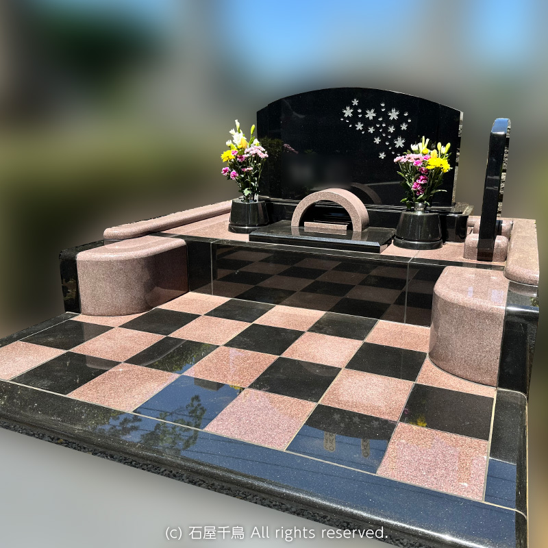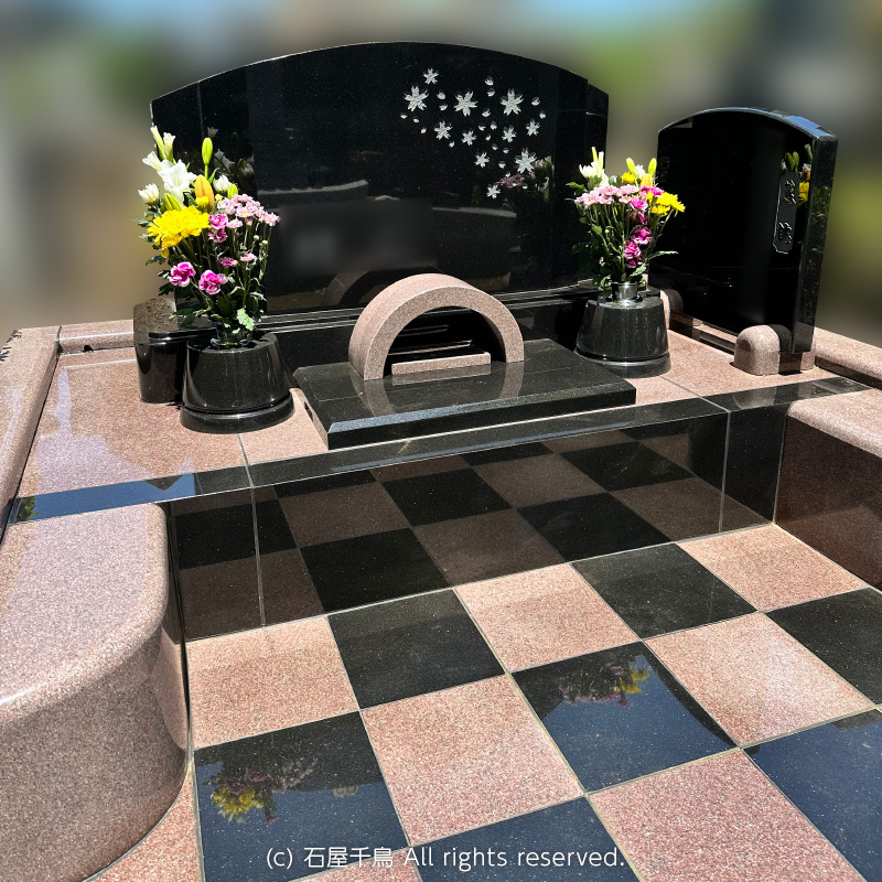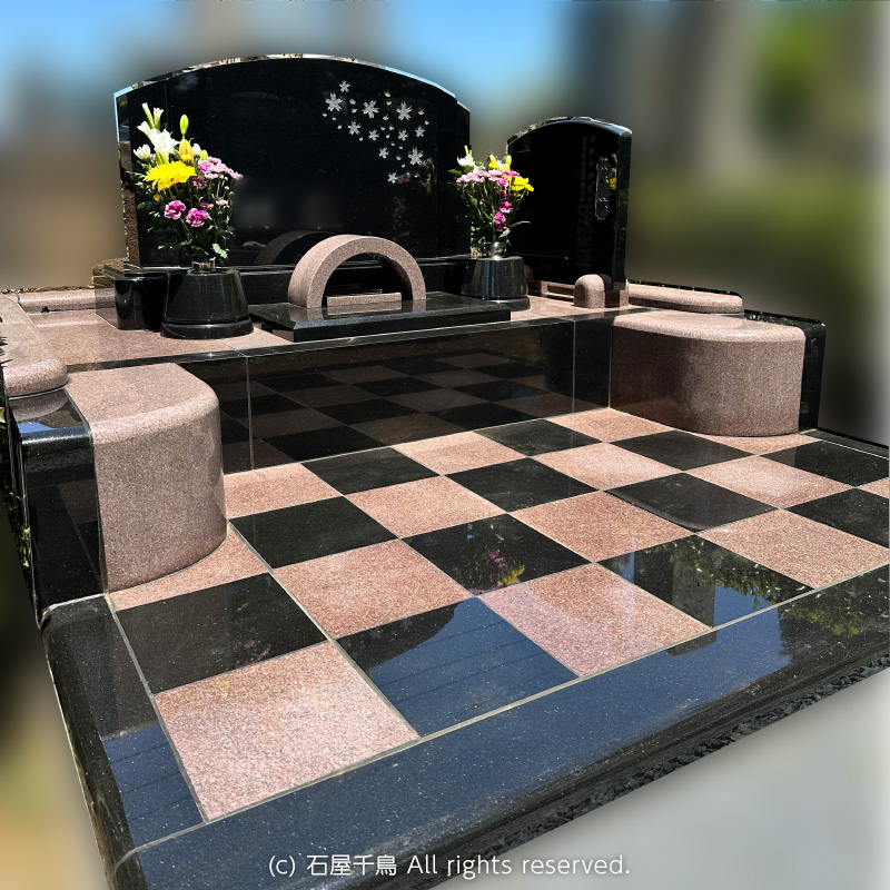 石屋千鳥です。この度、デザイン墓石 シャルルシリーズからMakoto[誠]をベースにデザインアレンジをさせていただきました。こちらのデザインは本来少しシャープな形状をしておりますが、ご希望により随所に丸みを持たせ、床面もチェック柄に変更いたしました。明るいお人柄だった故人様をイメージされたいというお客様のご希望に沿えることができましたようでスタッフ一同ほっとしております。本当に温かく柔らかくすてきなお墓でございました。故人様とご家族様の心休まる場所となりますことを、心よりお祈り申し上げます。この度は貴重なご縁を賜り、誠にありがとうございました。今後ともサポートはご安心してお任せくださいませ。