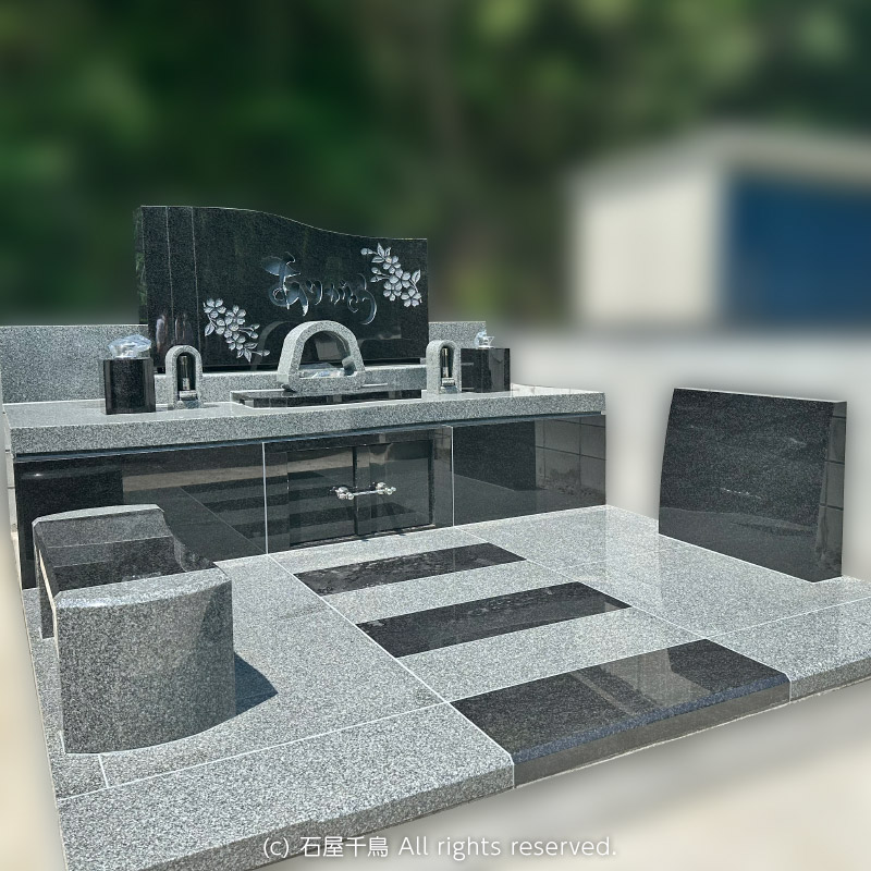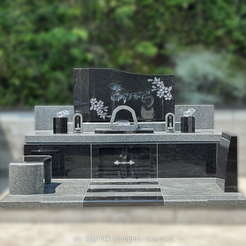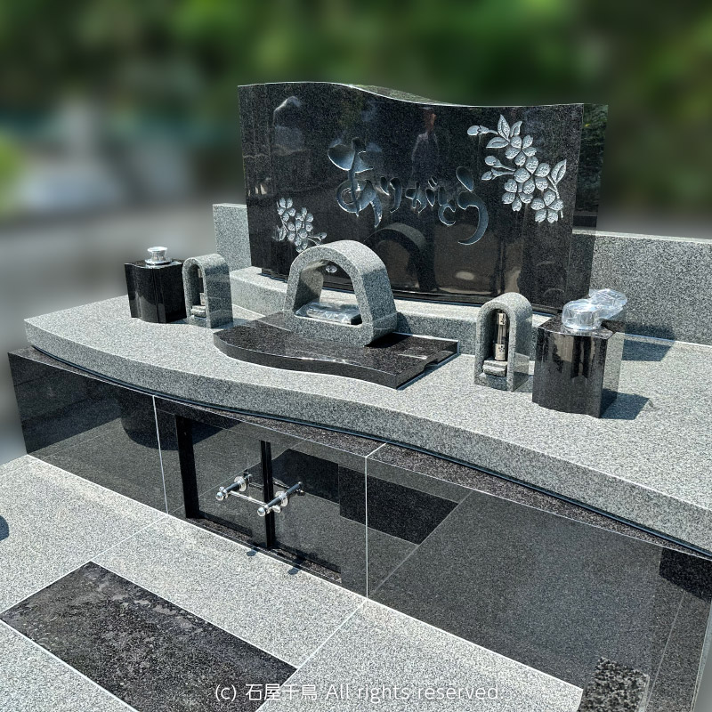 石屋千鳥です。この度、デザイン墓石 オーロラを建立いただきました。当店でも人気が高く、多くの建立実績がございますが、お客様それぞれ思いおもいにアレンジ頂き、同じお墓は1つとしてございません。こちらのデザインをとてもお気に召していただけ、VR墓石展示場にて実際のサイズ感などご確認され、ご成約いただきました。VRでご覧になったイメージと実物に差が無いとおっしゃっていただけたことは、少しでもお客様のご不安を軽減できた証として、スタッフ一同大きな励みにもなりました。もちろん実際に建立されたお墓はVRのCG以上の素晴らしさでございましたことは申し上げるまでもございません。この度当店にご縁を頂戴できましたこと、心より御礼申し上げます。今後ともどうぞ安心してサポートをお任せくださいませ。