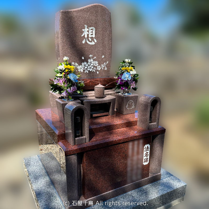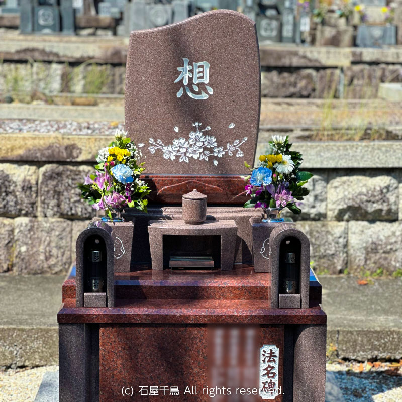 WORKS 三重県員弁郡のデザイン墓施工例(インド産ニューインペリアルレッド、八重桜)