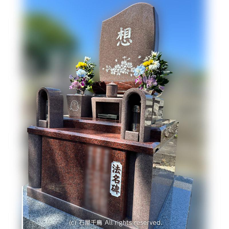本日は遠いところをお世話に来ていただき、本当にありがとうございます。おかげさまで無事にお墓が完成となり、父が安心して眠れる場所をつくることができたこと、家族もホッとしております。石屋千鳥さんには本当に丁寧に、私のわがままにも嫌な顔をなさらず最後まで寄り添っていただけましたこと、担当者さんはじめ事務局の皆様や直接お墓の建立に携わってくださった皆様に心から感謝いたします。最初にお墓を拝見させていただき、私たちの想像以上に素晴らしかったこと、お値段以上だと思いました。建立に際してもこうした方が今後の管理のためにいいですよ、などこちらに寄り添ったご意見をたくさんいただけました。それをふまえて色々と考えることができたこと、また、こちらの意見にも寄り添って考えていただけるので、わからないことは何度聞いても嫌な顔ひとつなさらずお答えいただけたことが安心してお願いできた理由だと思いました。私が石屋千鳥さんにお願いした理由は、洋風のお墓のデザインが素晴らしく沢山あったこと、ネットでそれを沢山見ることができたこと、電話のやり取りだけでなく(要所ではお電話連絡いただけましたが)メールでのやり取りができたこと、見積もりを出していただくスピードが早かったこと、あれこれと追加料金が発生しなかったこと、メールで見積もりをお願いしましたがこちらがお願いしたことは迅速に対応いただけますが、それ以外の勧誘は一切ないこと、が大きな理由です。いろんなご意見あると思いますが、一つの意見として参考いただければ嬉しいです。今日は綺麗な青空の下、法要を執り行うことができ本当に良かったです。また今後、何か困ったことがありましたらお願いさせていただきたいと思います。関わってくださった皆様にもよろしくお伝えくださいませ。