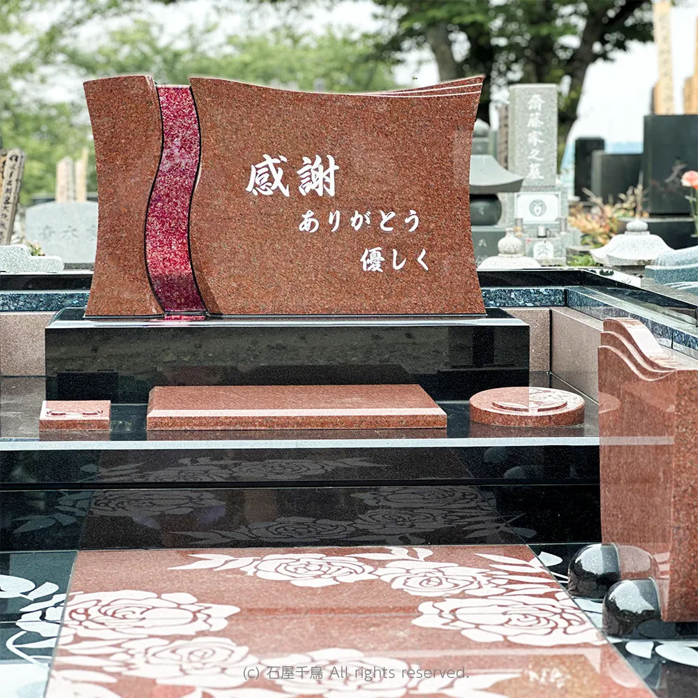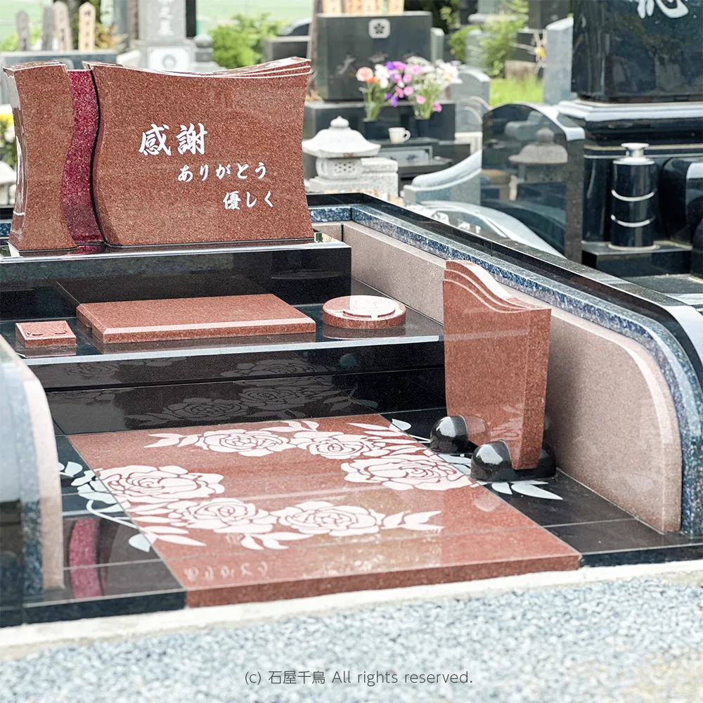 ガラスを入れて凄く良かったと思いました。床の薔薇も妻の好きな花を入れられて満足です。この辺りには無いデザインのお墓が出来て、たいへん満足しております。素敵なお墓をどうもありがとうございました。
